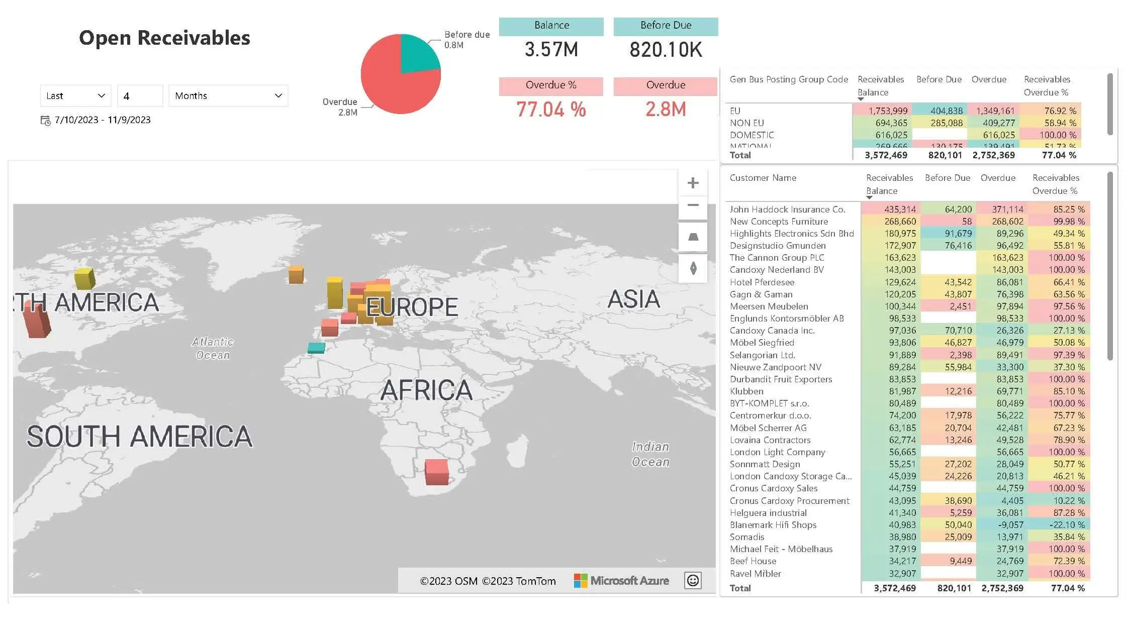 Visualize overdue receivables across the globe with an interactive map and detailed customer list.