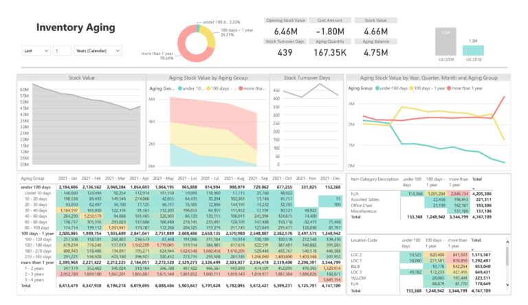 - Offers breakdowns by item category and location code, helping understand inventory performance across various segments.